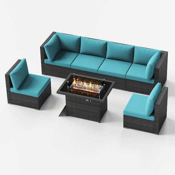 High Back Gray 7-Piece Wicker Patio Conversation Sectional Deep Seating Set with Fire Pit Table and Teal Cushions