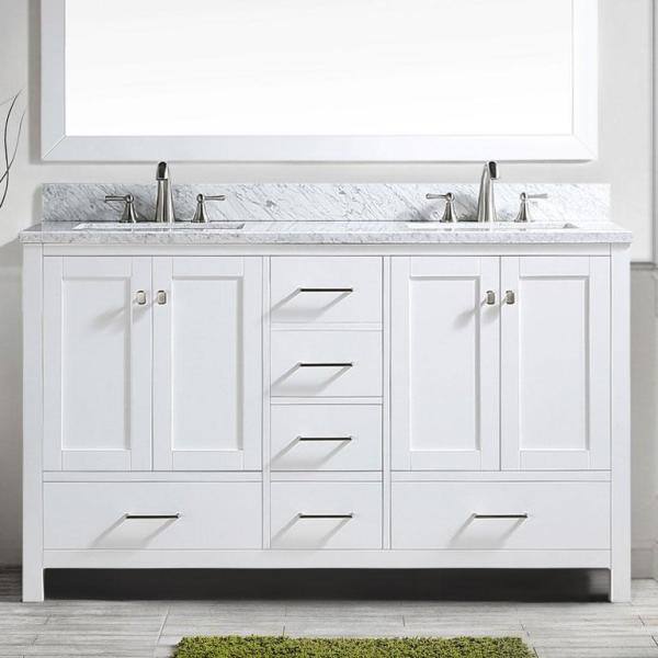 36 in. H x 60 in. W x 22 in. D Bath Vanity in White with Marble Top in Carrara White and White Double Basin