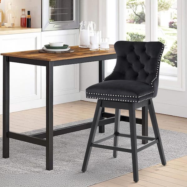 26 in. Black Velvet Upholstered Solid Wood Frame Counter Height Bar Stool Swivel Counter Stool with Back (Set of 1)