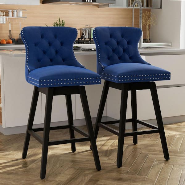 26 in. Blue Velvet Upholstered Solid Wood Frame Counter Height Bar Stool Swivel Counter Stool with Back (Set of 2)