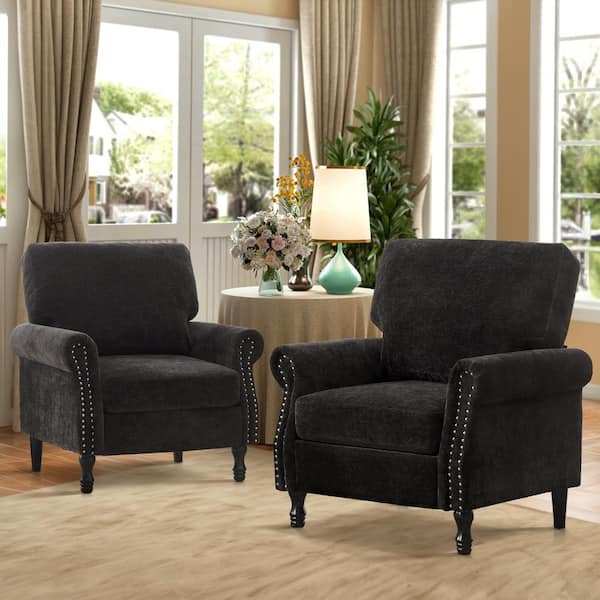 Black Chenille Upholstered Wood Frame Accent Arm Chairs (Set of 2)
