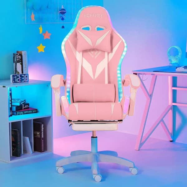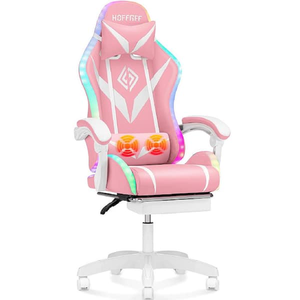 Faux Leather Massage Ergonomic Gaming Chair in Pink with LED Lights Footrest