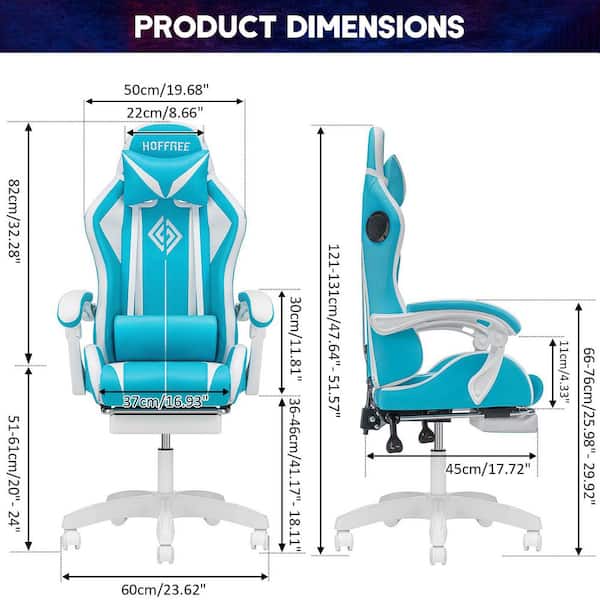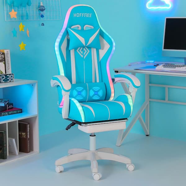 Faux Leather Massage Reclining Ergonomic Gaming Chair in Blue/White with LED Lights Adjustable Arms