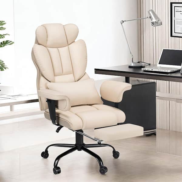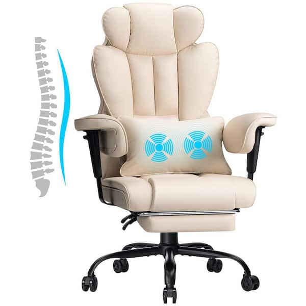 Faux Leather Reclining Ergonomic Executive Chair in Beige with Massage Lumbar Pillow and Adjustable Arms