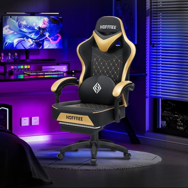 Faux Leather Reclining Ergonomic Gaming Chair in Gold with Vibration Lumbar Pillow and Footrest