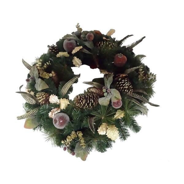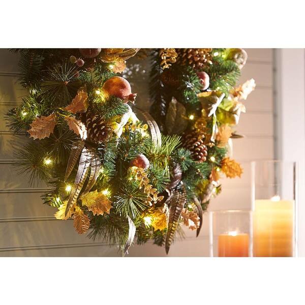 30 in. Battery Operated Feathers and Fruit Artificial Wreath with 50 Clear LED Lights