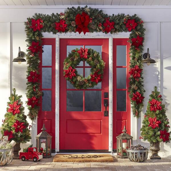 4 ft. Pre-Lit Incandescent Gold Glitter Cedar and Mixed Pine Porch Artificial Christmas Tree with Burgundy Poinsettias