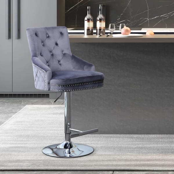 41 in. Grey Swivel Velvet Adjustable Bar Stool