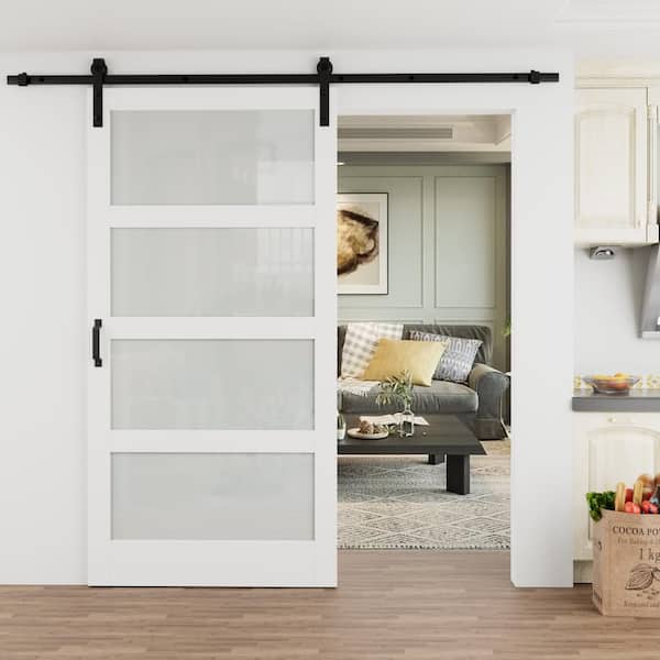 42 in. x 84 in. 4 Lite Tempered Frosted Glass White Prefinished MDF Barn Door Slab with Hardware Kit