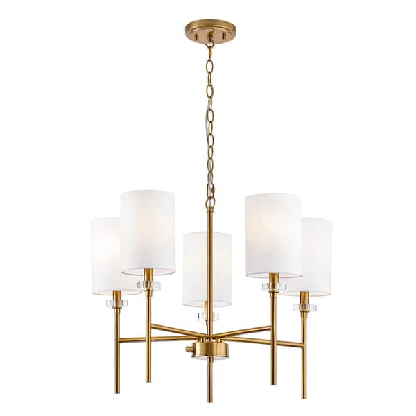 5 Light Modern Aged Brass Finish Chandelier With White Fabric Shades