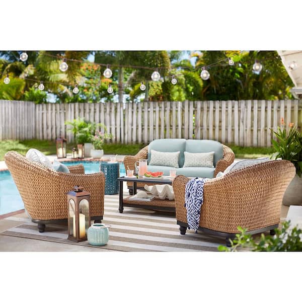 Camden Light Brown Seagrass Wicker Outdoor Patio Loveseat with Sunbrella Sunbrella Cast Spa & Fretwork Mist Cushions