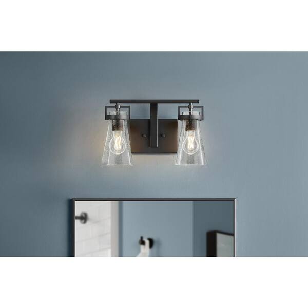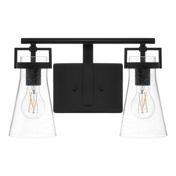 Clermont 14.75 in. 2-Light Matte Black Bathroom Vanity Light with Seeded Glass Shades