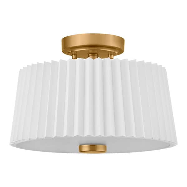 Emyvale 13 in. 2-Light Brushed Gold Flush Mount with White Fabric Shade