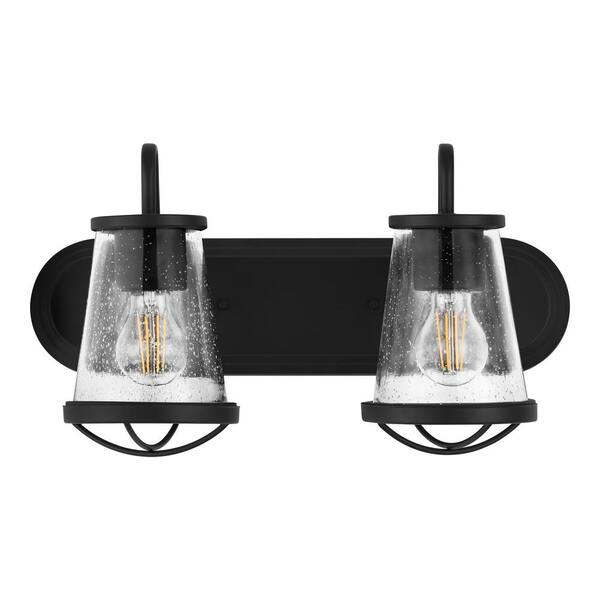 Georgina 18 in. 2-Light Matte Black Industrial Rustic Vanity with Clear Seeded Glass Shades and Cage Accents