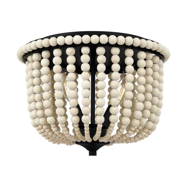 Harpswell 13 in. 2-Light Matte Black Flush Mount with Wood Beads Shade