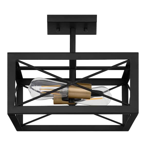 Harwood 12.5 in. 2-Light Matte Black and Old Satin Brass Semi-Flush Mount Ceiling Light with Cage Shade