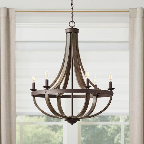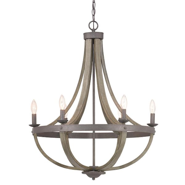 Keowee 26 in. 6-Light Artisan Iron Farmhouse Cage Chandelier with Rustic Distressed Elm Wood Accents