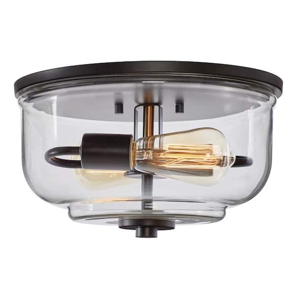 Knollwood 12 in. 2-Light Blackened Bronze Industrial Flush Mount with Vintage Brass Accents and Clear Glass Shade
