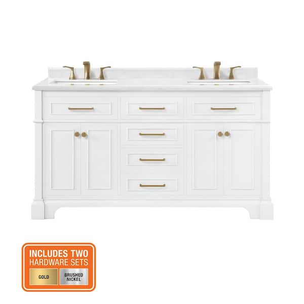 Melpark 60 in. Double Sink White Bath Vanity with White Engineered Marble Top (Assembled)