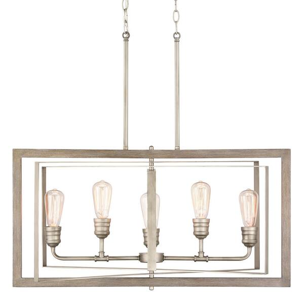 Palermo Grove 32 in. 5-Light Antique Nickel Farmhouse Linear Chandelier with Painted Weathered Gray Wood Accents