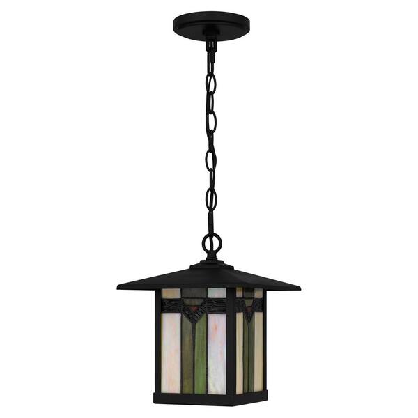 Sumner 10.88 in. 1-Light Matte Black Outdoor Hanging Light Pendant Light with Tiffany Glass Shade