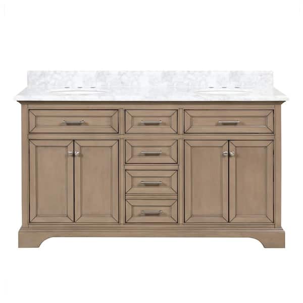 Windlowe 61 in. Double Sink Almond Taupe Bath Vanity with White Carrara Marble Top (Assembled)