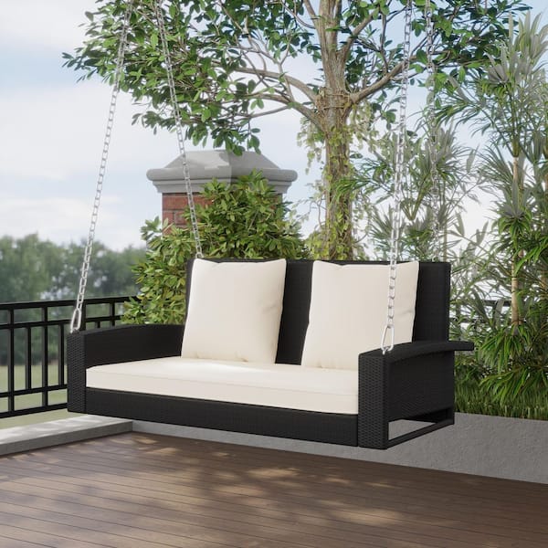 2-Person Brown Wicker Porch Swing with Beige Cushion and Pillows