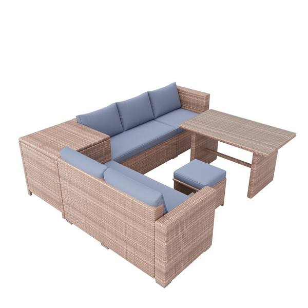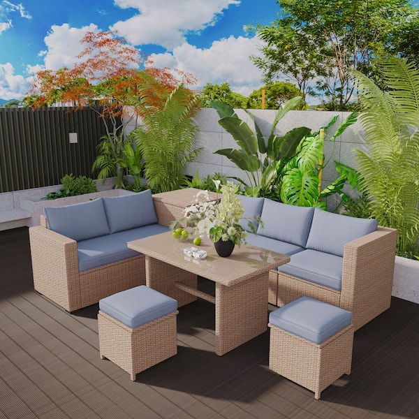 6-Piece Natural Wicker Outdoor Sectional Set with Adjustable Seat and Blue Cushions