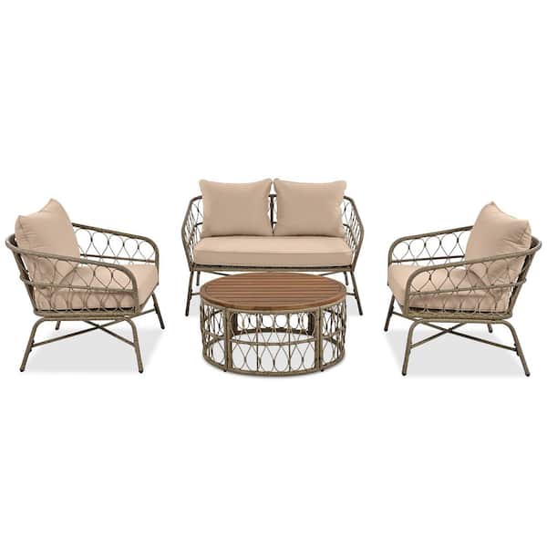 Beige 4-Piece Wicker Patio Conversation Set with Cushions