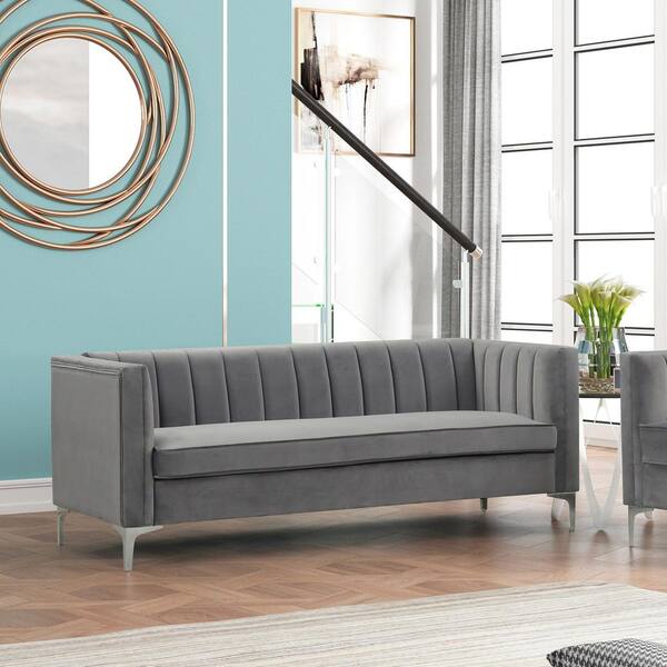 HomeDepot Collection 71 in. Wide Square Arm Velvet Mid-Century Square Sofa with Channel Tufted 3-Seater Couch in Gray