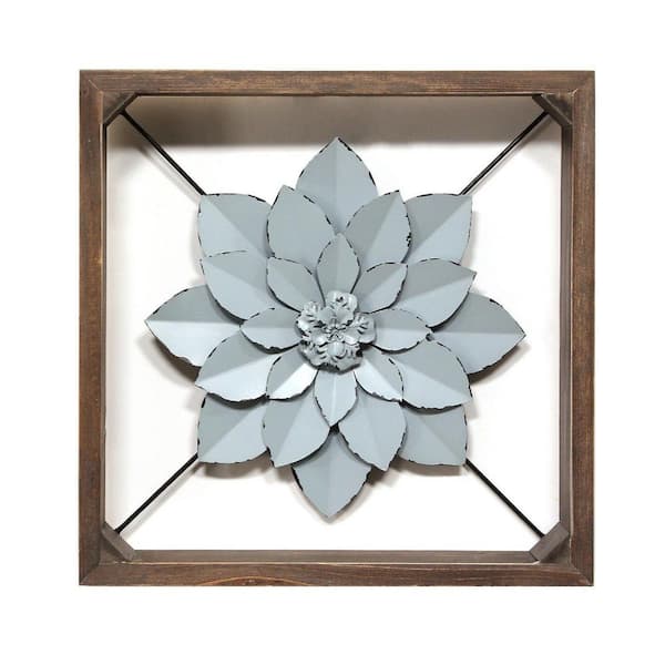 15.75 in. Dark Walnut, Blue Pale Blue Metal Flower in Walnut Frame