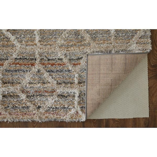 • Geometric design in tan and ivory adds visual interest