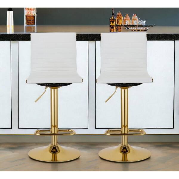 25 in. White and Gold Low Back Metal Adjustable Height Bar Chair with Faux Leather Seat Set of 2