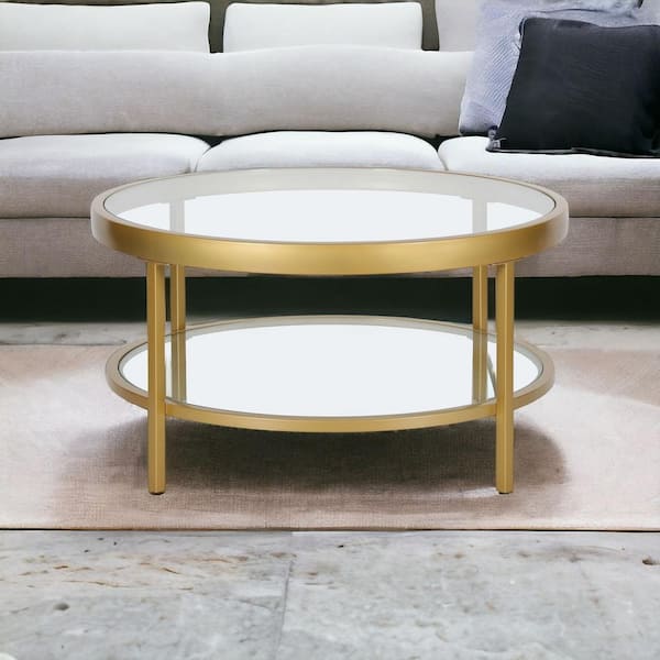 32 in. Gold Round Glass Coffee Table with Shelves Storage