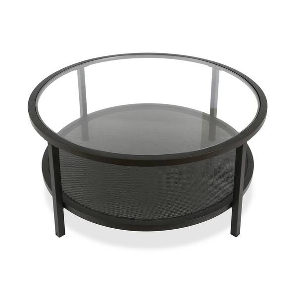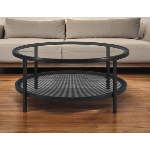 36 in. Black Round Glass Coffee Table with Shelves Storage