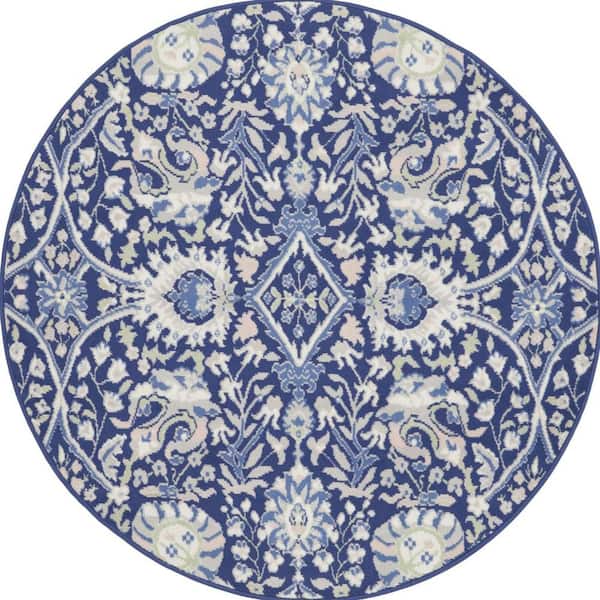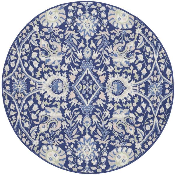 5 ft. Round Blue Floral Washable Area Rug