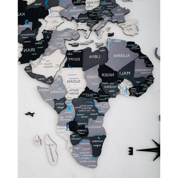 59 in. x 35 in. Black, Grey, White and Wood World Map Hanging Dimensional Wall Art 1-Piece