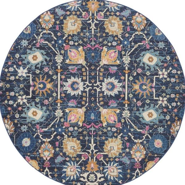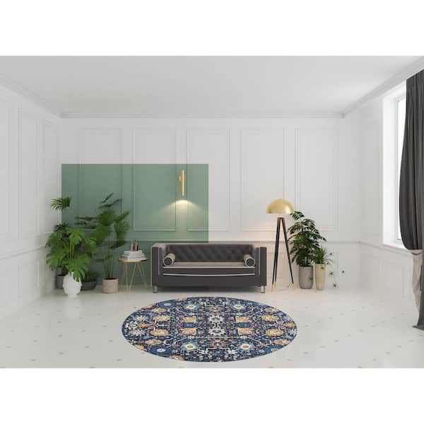 8 ft. Round Blue Floral Washable Area Rug
