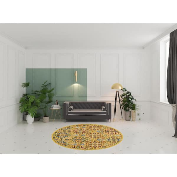 8 ft. Round Yellow Floral Washable Area Rug