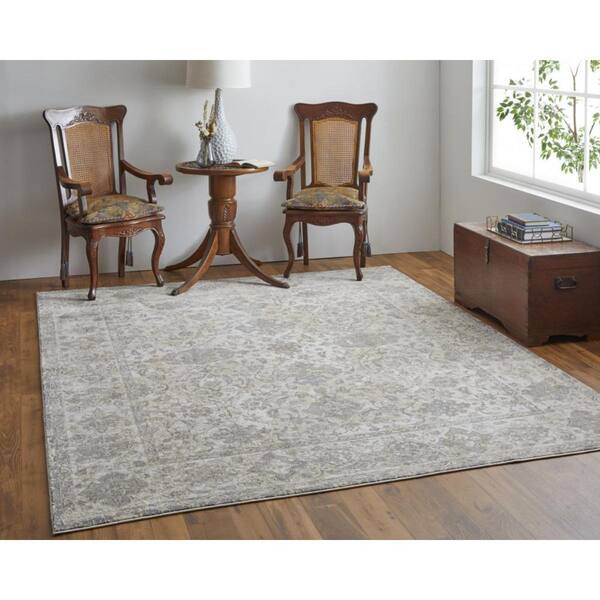 • Ivory tan and gray area rug with 1/2 inch thickness