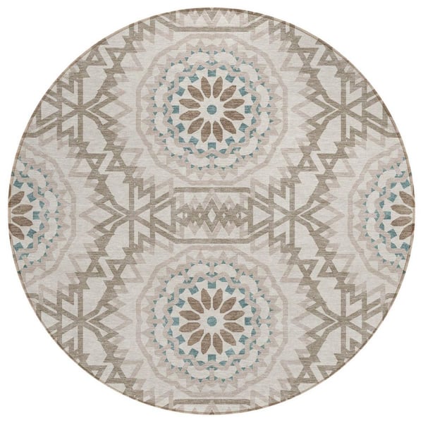 Beige, Brown, Teal Blue 8 ft. Round Woven Floral, Medallion Polyester Round Indoor/Outdoor Area Rug