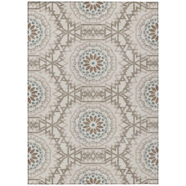 Beige, Brown, Teal Blue 9 ft. x 12 ft. Woven Floral, Medallion Polyester Rectangle Indoor/Outdoor Area Rug
