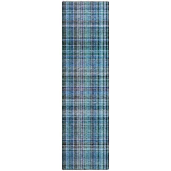 Blue, Gray 2 ft. x 8 ft. Woven Plaid Polyester Runner Indoor / Outdoor Area Rug