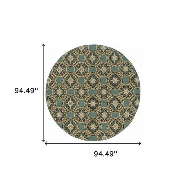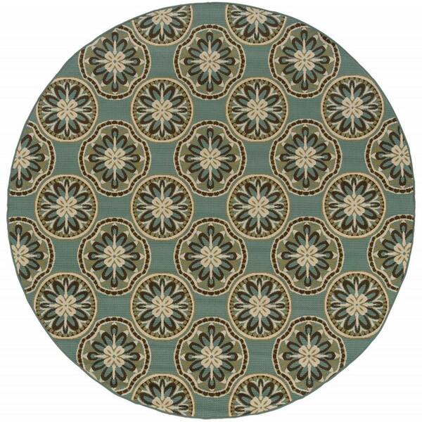 Blue, Ivory 8 ft. x 8 ft. Loomed Floral Polypropylene Round Indoor/Outdoor Area Rug