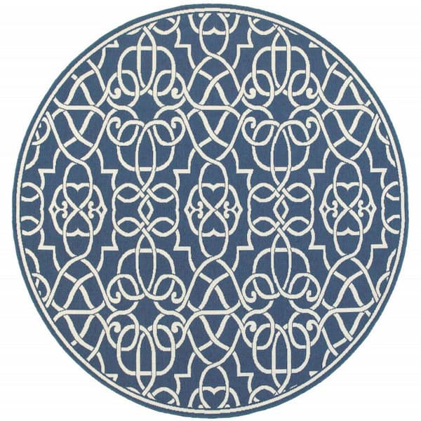 Blue, Ivory 8 ft. x 8 ft. Loomed Geometric Polypropylene Round Indoor/Outdoor Area Rug