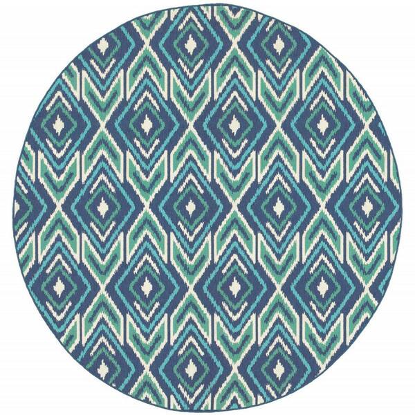 Blue, Ivory 8 ft. x 8 ft. Loomed Geometric Polypropylene Round Indoor/Outdoor Area Rug