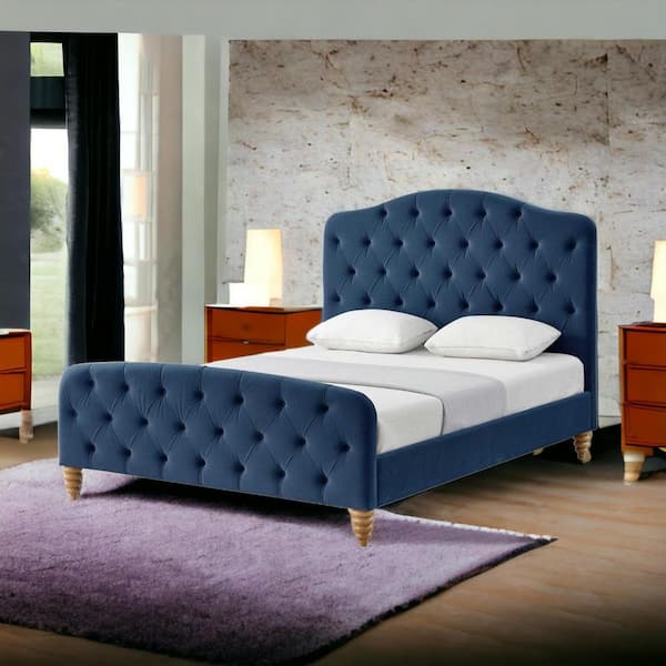 Blue Wood Frame Twin Panel Bed with Tufted Upholstered