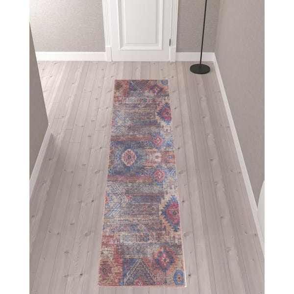 Blue and Red 2 ft. x 10 ft. Geometric Power Loom Distressed Washable Runner Rug