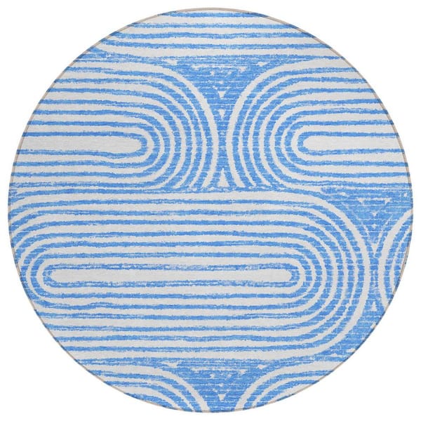 Blue and White 8 ft. Round Woven Abstract Round Indoor/Outdoor Area Rug