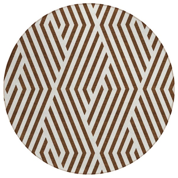 Brown and White 8 ft. Round Woven Geometric Round Indoor/Outdoor Area Rug